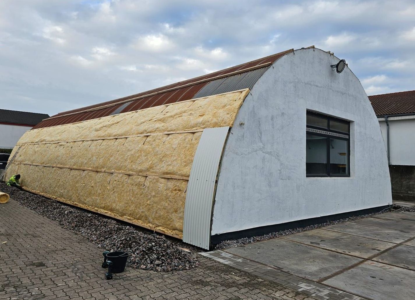 60 mm thick mineral wool is used. Since this process takes place from the outside, you can also have existing halls insulated without having to clear them out or remove installations.