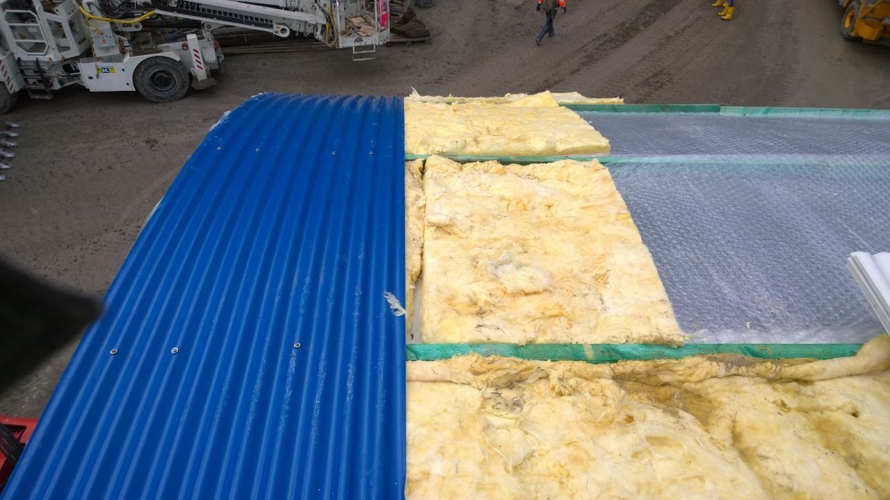 Construction and assembly of a quick-build hall with insulation. The hall is completely covered with double-layered roofing, with the mineral wool being laid before the second corrugated sheet roof is installed. The standard is a